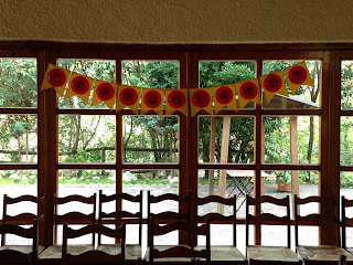 Per decorare la sala ho preparato delle bandierine con la scritta "finalmente" e delle girandole colorate. Purtroppo le foto non rendono giustizia, perchè c'era una finestra di vetro che ha un pò distrubato le foto... l'idea, comunque, si vede lo stesso...